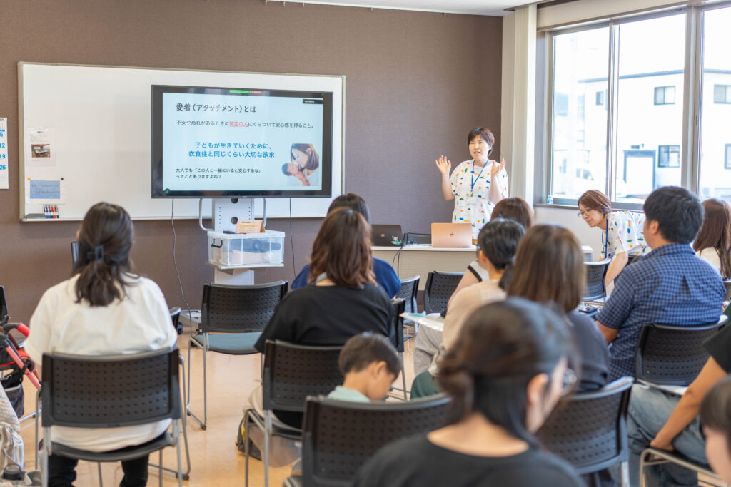 この日は、保護者向けの講話も実施。こどもの成長を「信じて見守る」とはどういうことなのか、こども商店街の運営スタッフであり助産師の大森美和さんよりお話していただきました。