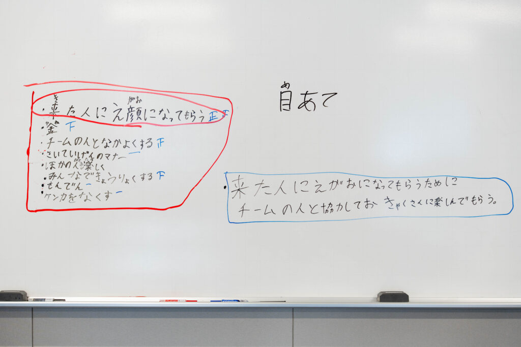 他のチームがどんなことをやるのか、どの場所で出店したいのか、具体的にイメージしていきます。お客さん何人くらい来て欲しい?どのくらい準備する?景品は足りる?などを確認しながら、あらためて各チームの目標を設定します。「売上No.1!!」を目標にするチームもいれば、「お客さんに喜んでもらう」「とにかく楽しむ」「美味しいものを作って、販売する」など、さまざまです。