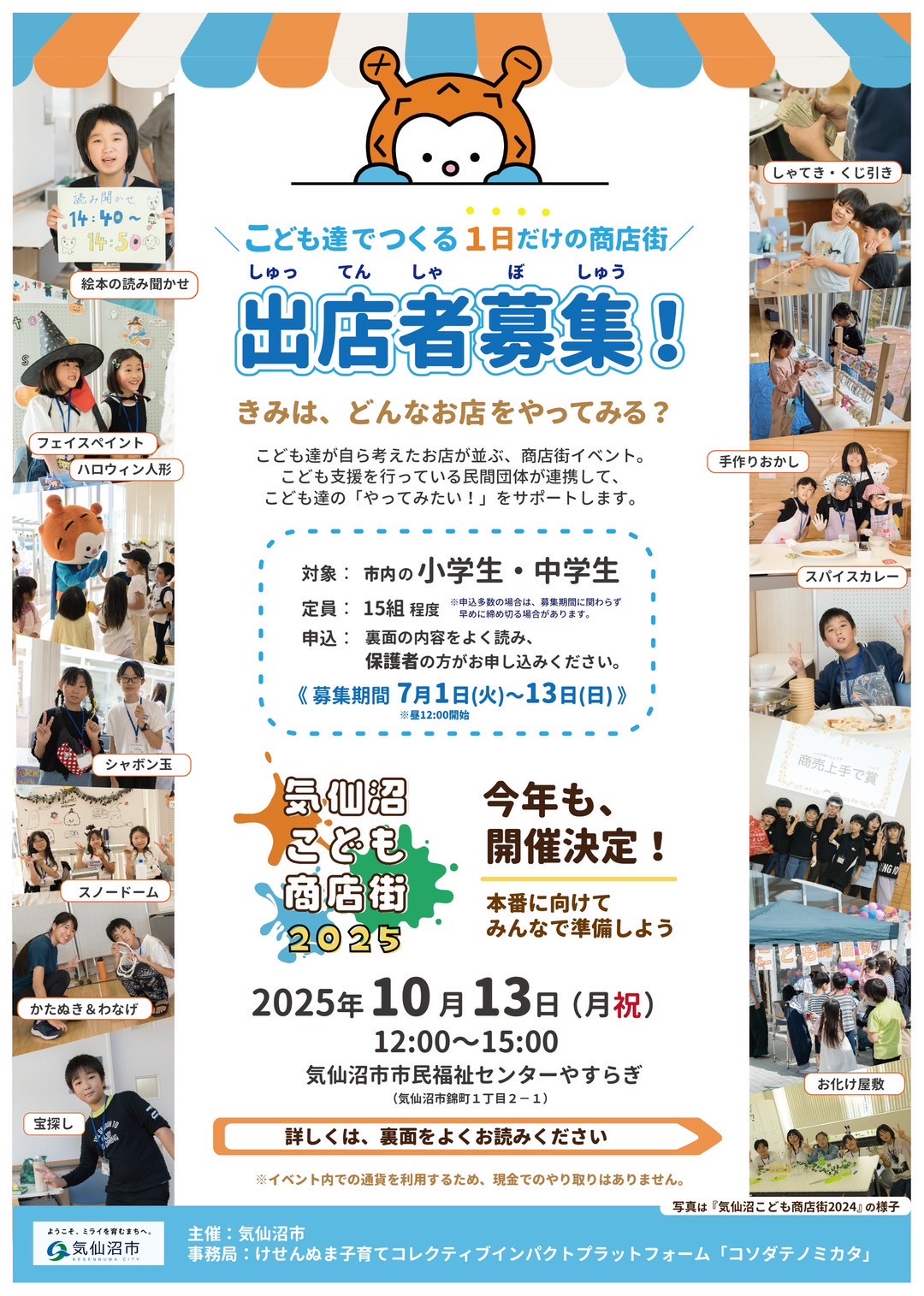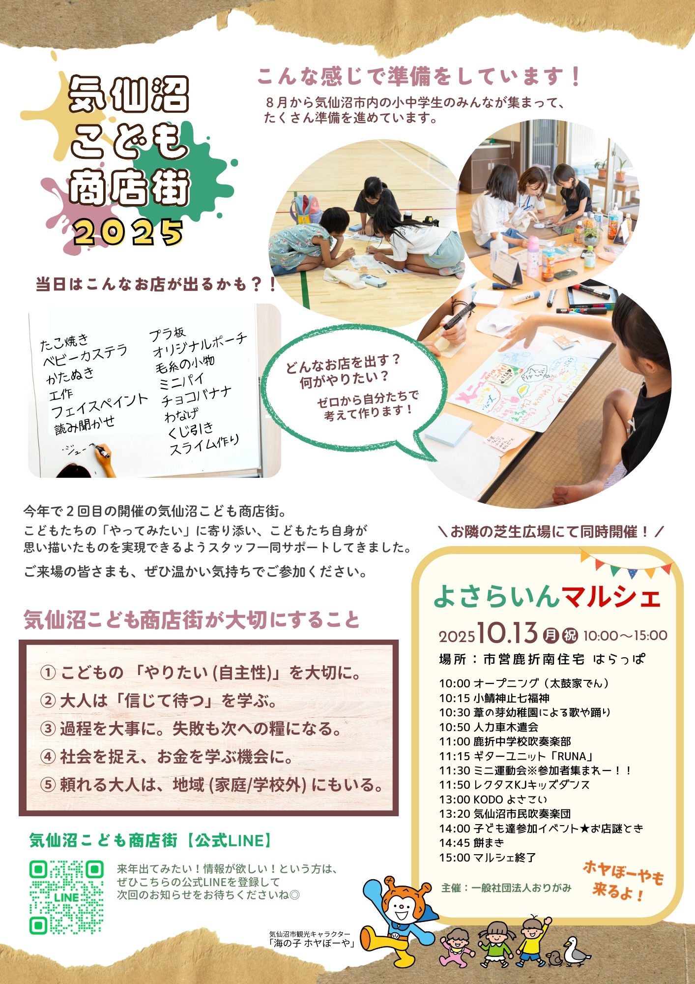 2025年10月13日(月祝)気仙沼市市民福祉センターやすらぎ にて、「気仙沼こども商店街2025」を開催しました!こどもたちが自ら考えたお店が並ぶ、1日だけの商店街イベントです。こども支援を行っている民間団体等が連携して、こどもたちの「やってみたい」をサポートしています。