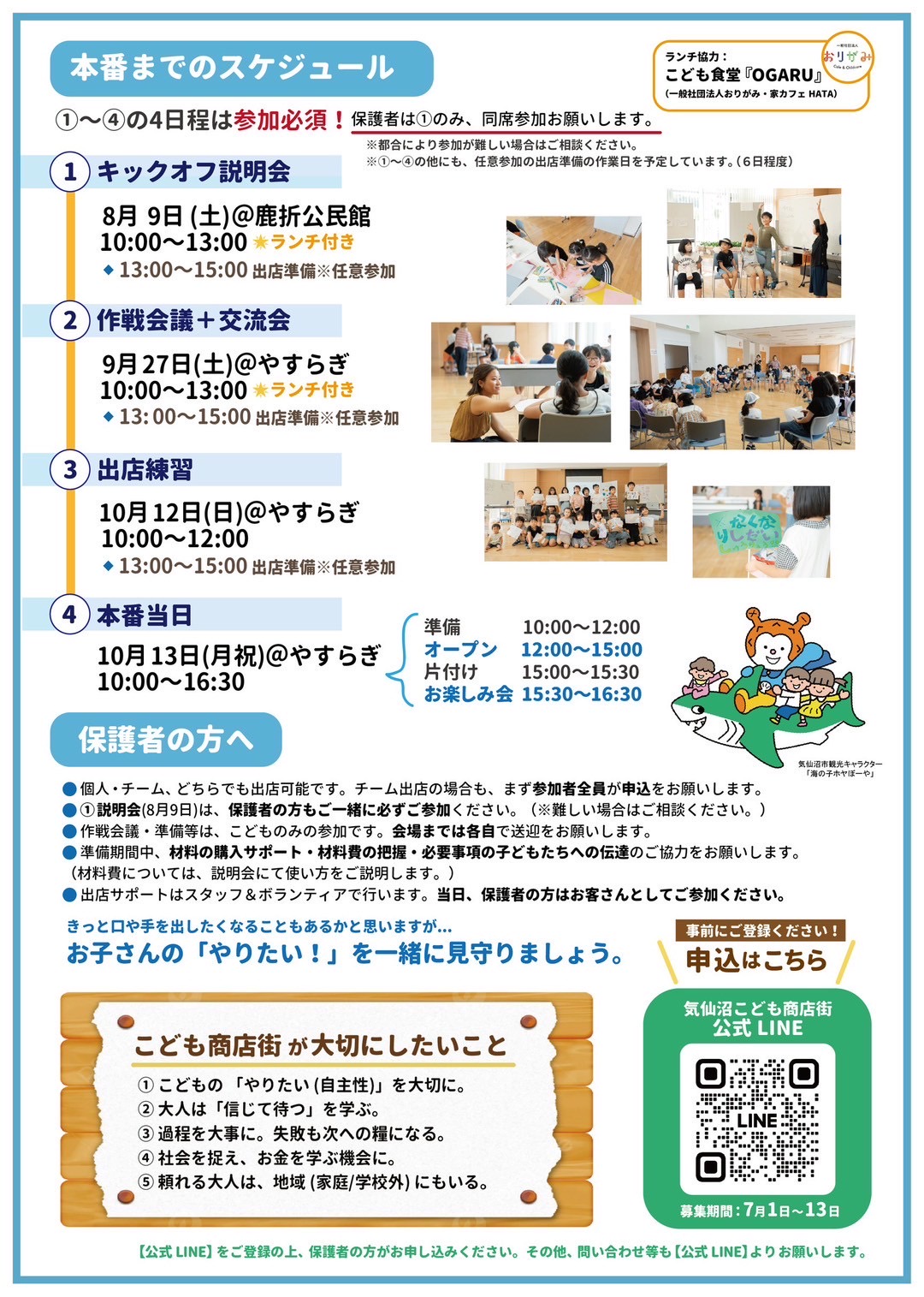 今回は、去年のプレ開催に続いての2回目の開催。公民館や児童館、各子育て支援施設を通して出店者を募集し、今年は46名、15組のこどもたちが集まりました。